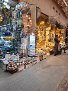 Visite du souk et arrêt à la place des Epices au café des Epices, endroit agréable pour faire une halte avec une clientèle branchée et internationale au milieu des vendeurs de paniers