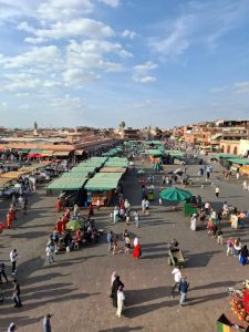Après les derniers achats dans le souk, nous sommes montés boire un verre sur la terrasse d’un café à la place Djemaa El Fna. En fin d’après-midi, la place s’anime et offre un spectacle bruyant et haut en couleur assez fascinant. L’atmosphère est incroyable avec les artistes de rue, les musiciens qui créent une ambiance unique que l’on ne voit nulle part ailleurs.