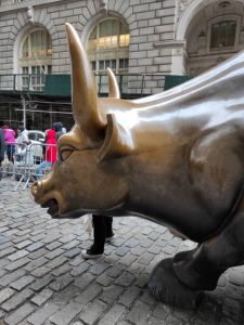 En chemin, vous traversez le quartier financier de New York où vous pouvez voir le taureau de Wall Street. Vous pouvez faire la queue pour lui toucher les cornes ou les testicules, il parait que ça porte chance…