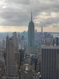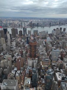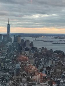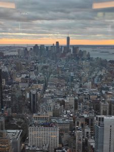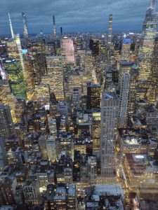 Après avoir mangé dans un restaurant Starbucks situé aux alentours, nous sommes rentrés à l’intérieur de ce magnifique gratte-ciel. L’ascenseur ultra rapide monte les 86 étages en moins d’une minute. Nous avons fait la visite en fin d’après-midi , c’est un moment magique pour voir les gratte-ciels s’illuminer  au fur et mesure que le jour tombait depuis la plate-forme d’observation à 360 degrés. La vue est époustouflante et permet de voir toute la ville. Au sud on peut admirer l’emblématique One World Trader Center , le quartier financier et la statue de la Liberté en arrière-plan. Au nord, on peut voir le Chrysler Bulding et le Rockfeller Center .