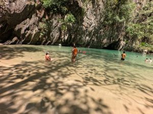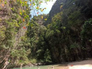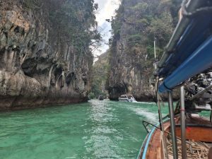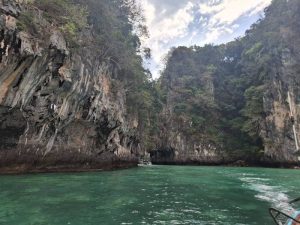 et surtout de faire un arrêt pour visiter l’Emerald Cave sur l’île de Kho Muk sans la foule. Nous avons traversé la grotte à la nage pour arriver dans un puits de lumière magnifique avec un petit lagon couleur émeraude. Cet endroit uniquement accessible à la nage à marée basse avec sa petite plage entourée de falaises luxuriantes offre une expérience unique.