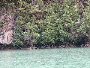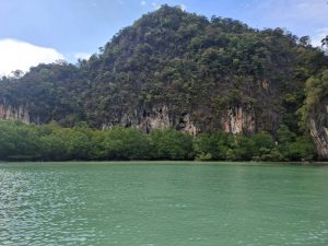 A 14 heures nous avons regagné le bateau et avons fait le tour du lagon qui n’est accessible qu’à marée haute. C’est une piscine naturelle couleur émeraude, entourée de roches karstiques et de mangrove. Les bateaux se suivent les uns derrière les autres, sans s’arrêter, pour faire le tour de ce site exceptionnel. Il est possible de visiter le lagon et les îles Hong en excursion en petit groupe avec Krabi Dome où vous avez une expérience plus intime avec la possibilité de faire des arrêts pour faire des photos exceptionnelles. Nous avons fait cette excursion lors de notre précédent séjour avec un repas au coucher de soleil sur une petite île et un arrêt à la tombée de la nuit pour voir du plancton bioluminescent. C’est une excursion magnifique que je recommande, il faut compter 2500 baths par personne mais elle vaut vraiment le coup.