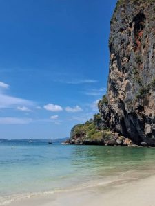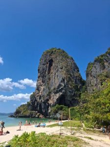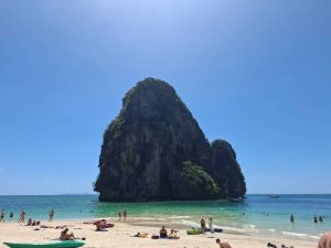 C’est la plus facile d’accès. Pour vous à Railey rendre, il vous suffit d’acheter un billet aller/retour pour 200 baths au kiosque, en bas de la rue principale devant la plage. Cette plage est accessible uniquement en longtail, il faut une dizaine de minutes pour y arriver. Il faut traverser la rue principale avec ses boutiques et ses restaurants et ensuite toujours prendre à droite pour y accéder. Entre falaises de calcaires et rochers plantés dans la mer, sable blanc et eau cristalline, c’est une des plus belles plages  de Krabi. Si vous allez tout au bout de la plage, vous pouvez accéder à la Bate Cave où la vue est époustouflante et où vous pourrez prendre de magnifiques photos. Si vous voulez y allez, prévoyez de mettre des chaussures anti-dérapantes car vous pouvez facilement glisser. C’est une plage agréable pour passer la journée car il y a des arbres au fond de la plage pour trouver de l’ombre entre deux baignades. Au retour, vous pouvez manger à toute heure dans l’un des nombreux restaurants de la rue principale.