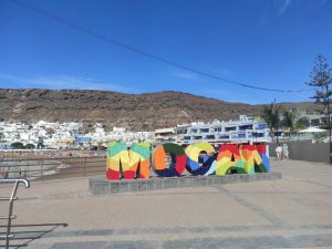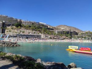 Nous sommes allés à Anfi del Mar, situé à côté d’Arguineguin. Il s’agit d’une plage artificielle de sable blanc avec des eaux calmes et cristallines. On peut y accéder par un ascenseur ou par un chemin qui mène au complexe ou il y a beaucoup de bars et de restaurants. Nous avons d’ailleurs mangé là-bas dans un restaurant de style mexicain.