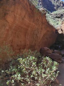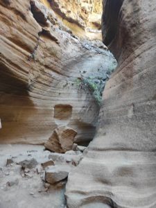 Nous sommes partis  visiter le Barranco de las Vacas. Il s’agit d’une curiosité naturelle avec un couloir rocheux de 50 mètres qui ressemble aux canyons de l’Arizona en version miniature. Il est situé sur une route sinueuse (6C-550). Il n’y a pas de parking, il faut se garer le long de la route. Pour y accéder il faut passer la barrière de sécurité au niveau du virage et suivre un petit sentier en descente pour arriver à un petit tunnel qui mène au canyon.
