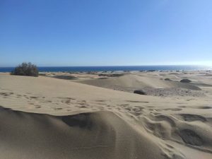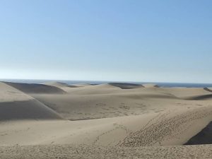 Arrivée tôt le matin : nous avons fait un arrêt aux dunes de Maspalomas (nous ne pouvions avoir notre hébergement que dans l’après-midi) . Il s’agit d’une réserve naturelle, mélange de désert et d’oasis au bord de l’océan.